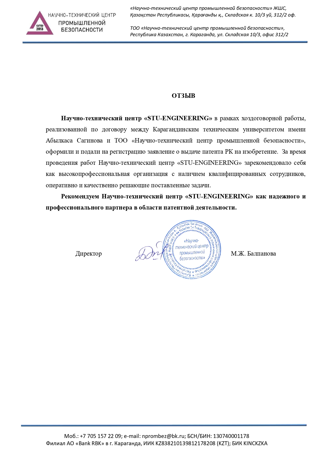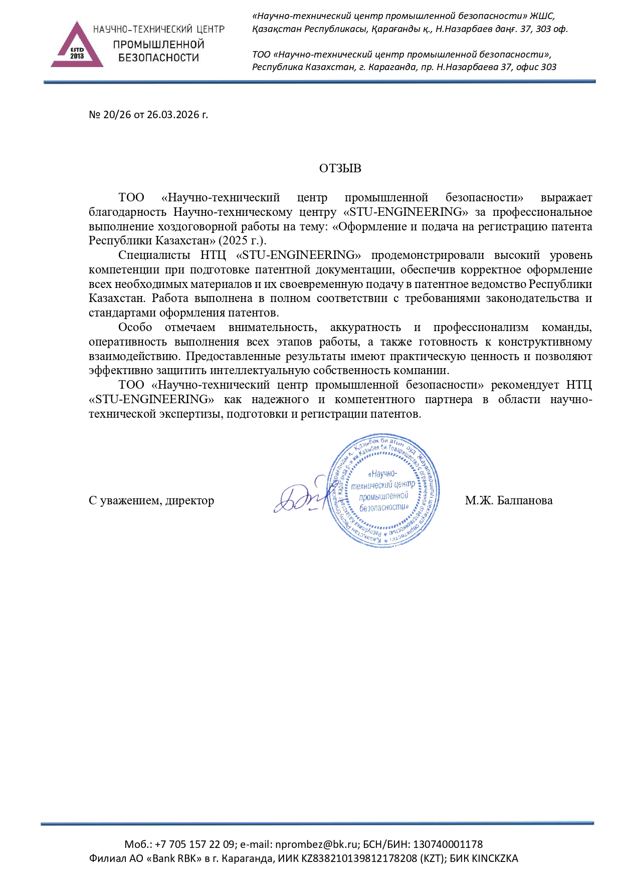 3 | «ҚР патентін ресімдеу және тіркеуге беру» тақырыбындағы шаруашылық келісімшарттық жұмыс орындалды («Научно-технический центр промышленной безопасности» ЖШС, 2025 ж.) | «Научно-технический центр промышленной безопасности» ЖШС пікірі ![]() |