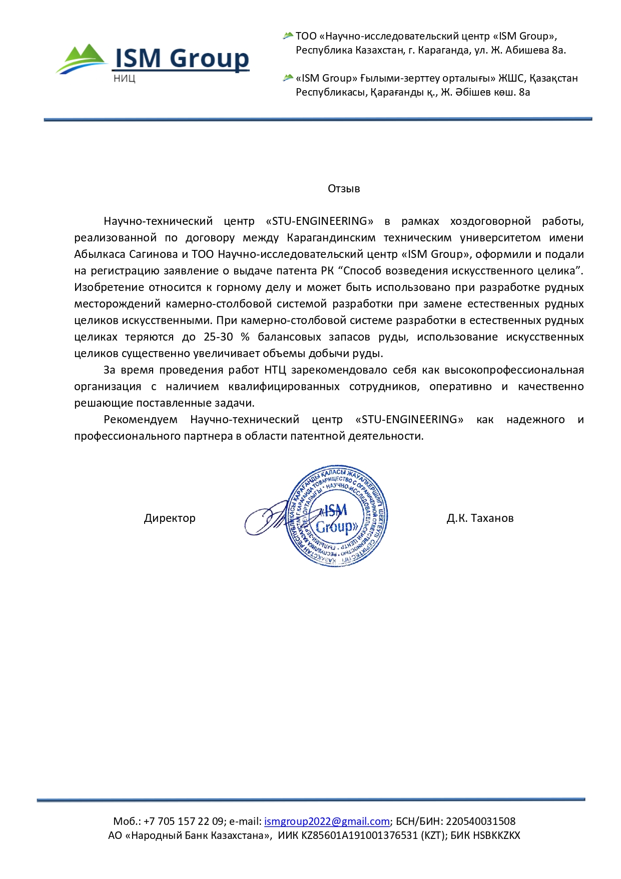 5 | «ҚР патентін ресімдеу және тіркеуге беру» тақырыбындағы шаруашылық келісімшарттық жұмыс орындалды («ISM Group» ғылыми-зерттеу орталығы ЖШС, 2023 ж.) | «Научно-исследовательский центр «ISM Group» ЖШС пікірі ![]() |