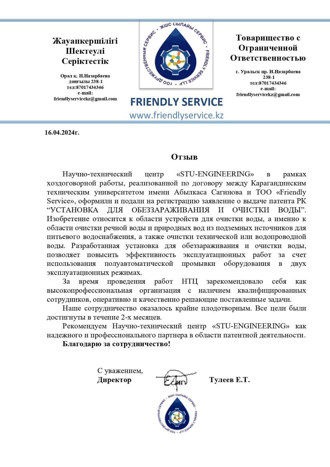 4 | «ҚР патентін ресімдеу және тіркеуге беру» тақырыбындағы шаруашылық келісімшарттық жұмыс орындалды («Friendly Service» ғылыми-зерттеу орталығы ЖШС, 2024 ж.) | «Friendly Service» ЖШС пікірі ![]() |