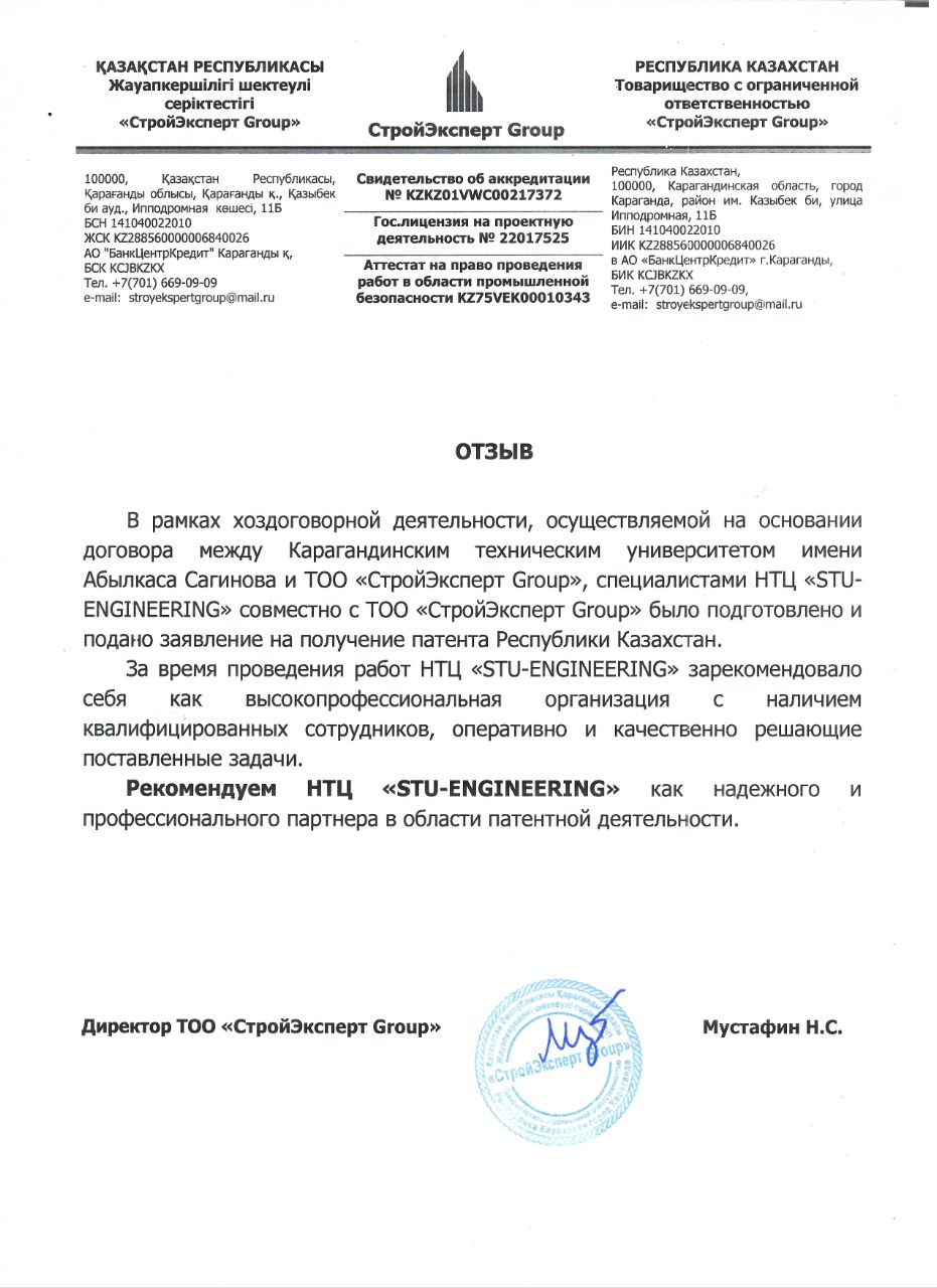 2 | «ҚР патентін ресімдеу және тіркеуге беру» тақырыбындағы шаруашылық келісімшарттық жұмыс орындалды («СтройЭксперт Group» ЖШС, 2025 ж.) | «СтройЭксперт Group» ЖШС пікірі ![]() |