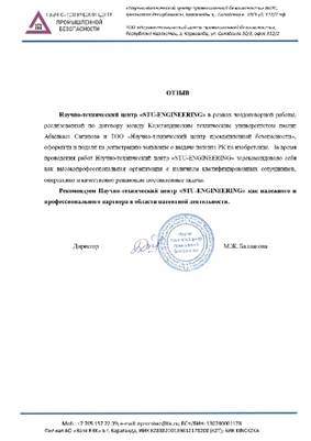 4 | Выполнена хоздоговорная работа на тему «Оформление и подача на регистрацию патента РК» (ТОО «Научно-технический центр промышленной безопасности», 2025 г.) | Отзыв от ТОО «Научно-технический центр промышленной безопасности»