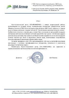 2 | Выполнена хоздоговорная работа на тему «Оформление и подача на регистрацию патента РК» (ТОО «Научно-исследовательский центр «ISM Group», 2023 г.) | Отзыв от ТОО «Научно-исследовательский центр «ISM Group»